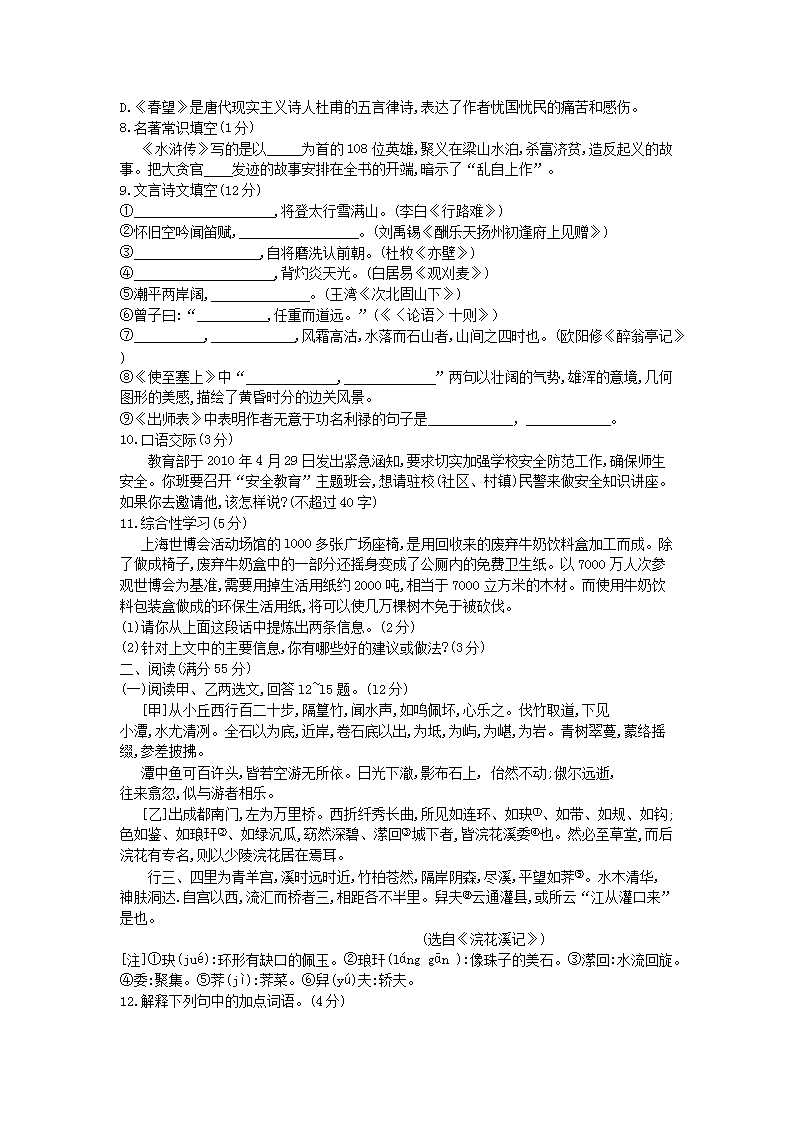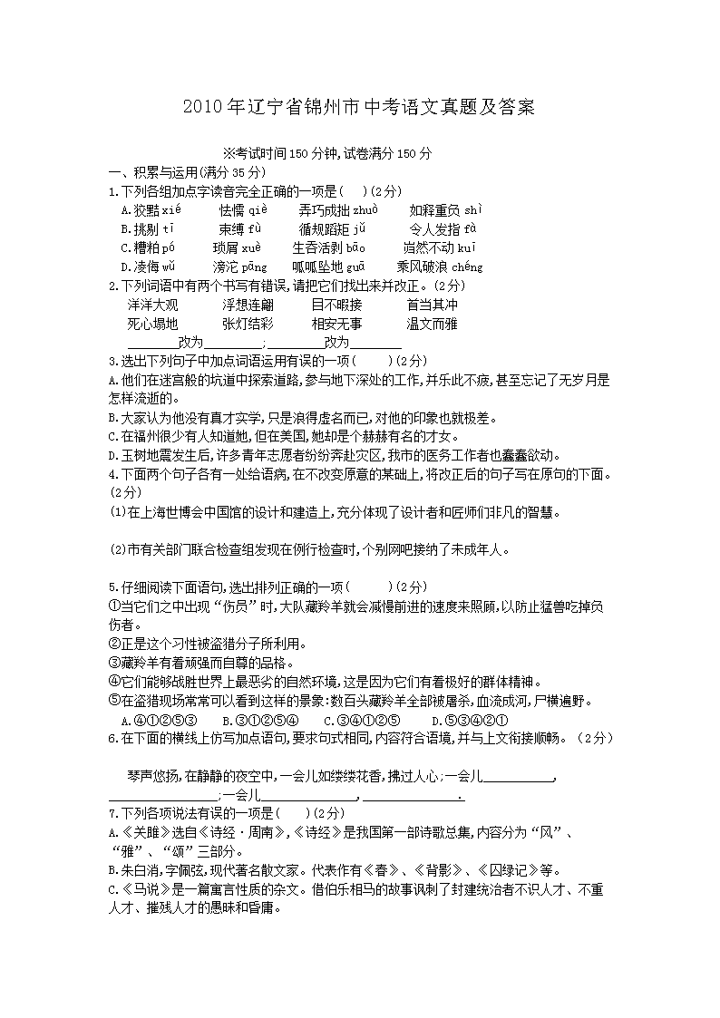 【文档名称】 2010年辽宁省锦州市中考语文真题及答案(Word版).doc