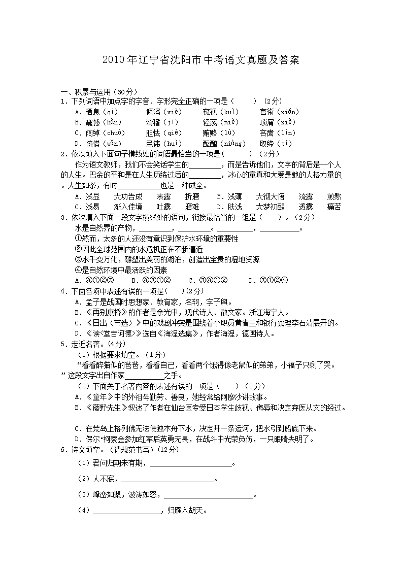 【文档名称】 2010年辽宁省沈阳市中考语文真题及答案(Word版).doc