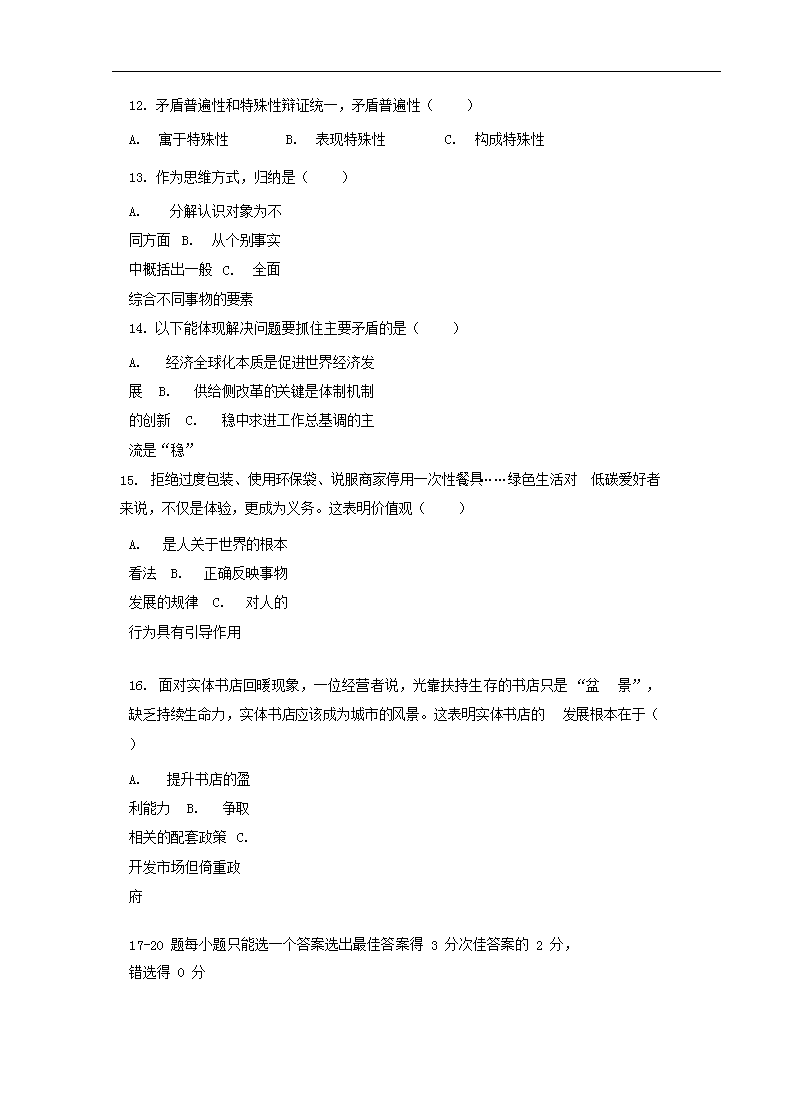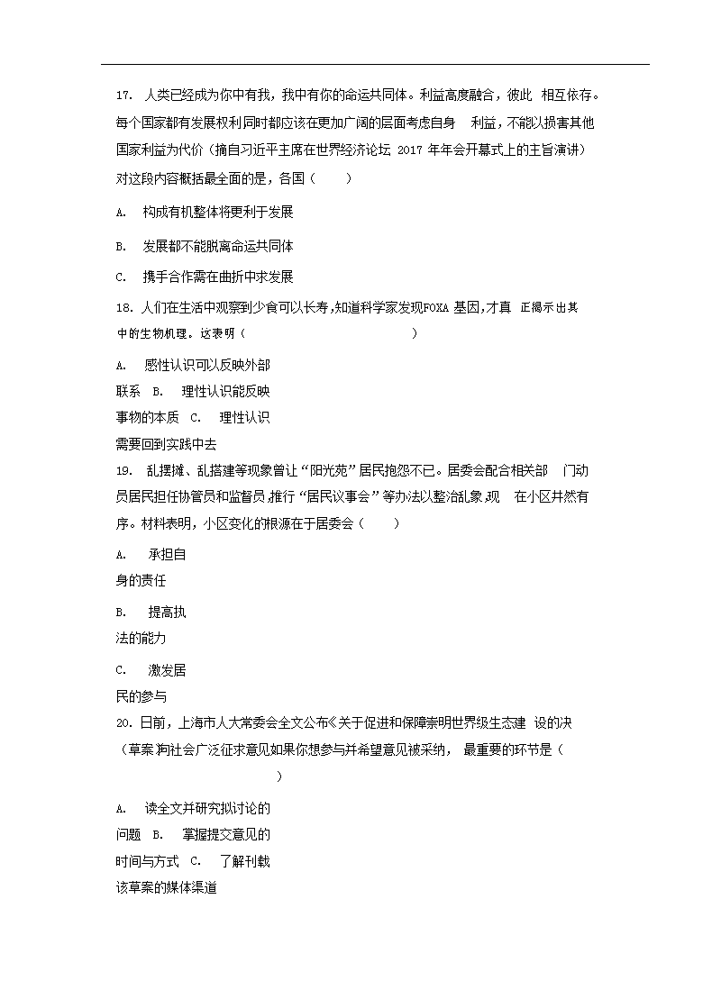 【文档名称】 2017年上海普通高中会考政治真题及答案(Word版).doc