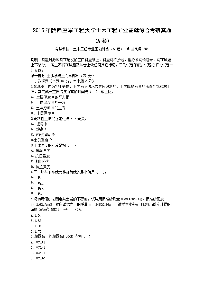【文档名称】 2016年陕西空军工程大学土木工程专业基础综合考研真题(A卷)(Word版).doc
