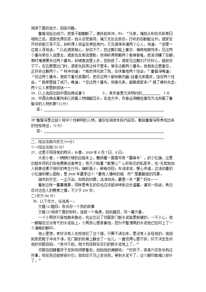 【文档名称】 2009年吉林松原中考语文真题及答案(Word版).doc