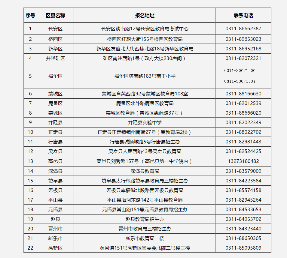 从石家庄市教育考试院了解到,2022年河北省高考报名期间石家庄市各区县咨询联系方式,现将有关事宜公布如下:
