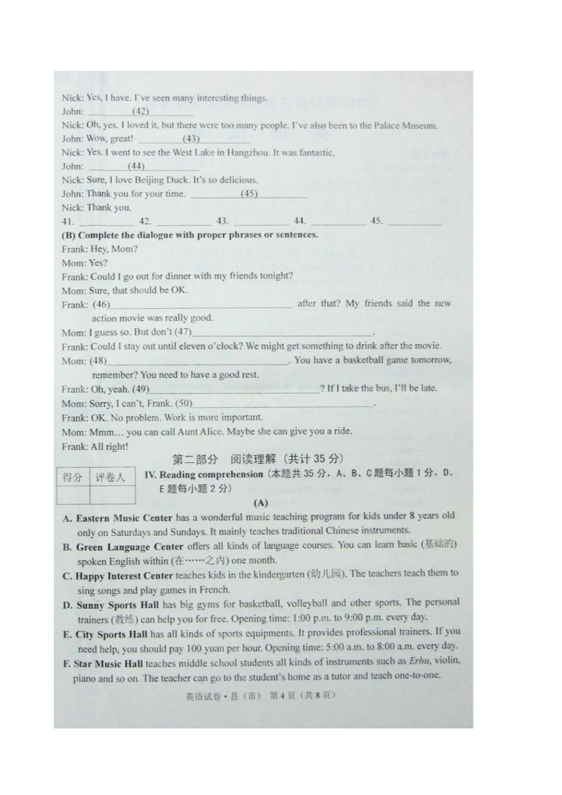 【文档预览】 无忧考网整理发布2014年黑龙江牡丹江中考英语真题及答案(图片版),前五页预览如下: