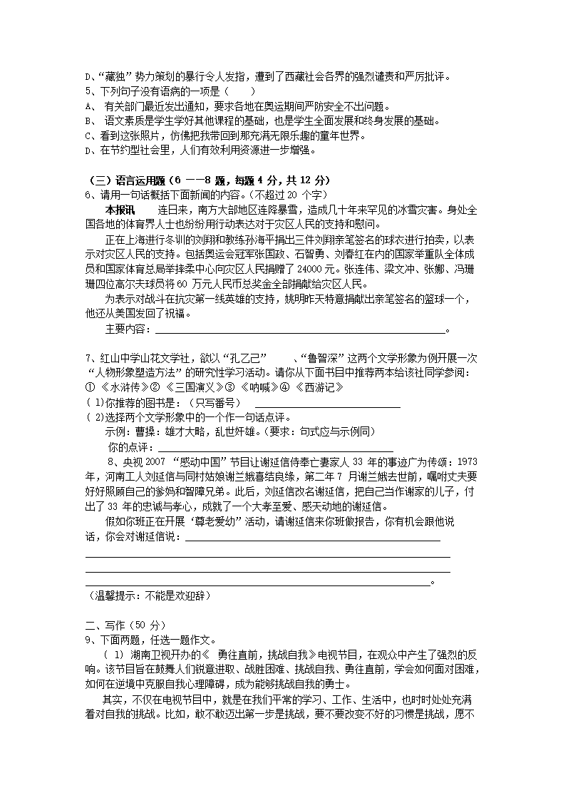 【文档预览】 无忧考网整理发布2008年四川省宜宾市中考语文真题及答案(Word版),前五页预览如下: