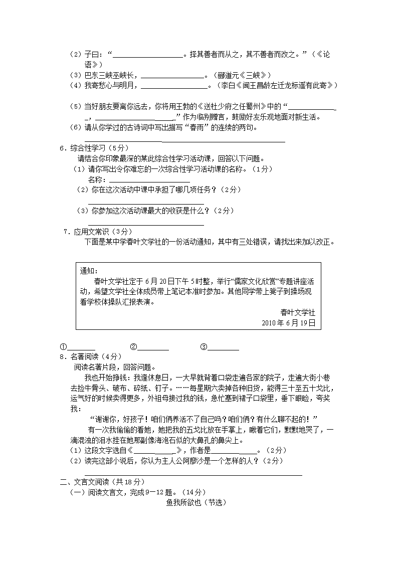 【文档名称】 2010年新疆兵团中考语文真题及答案(Word版).doc