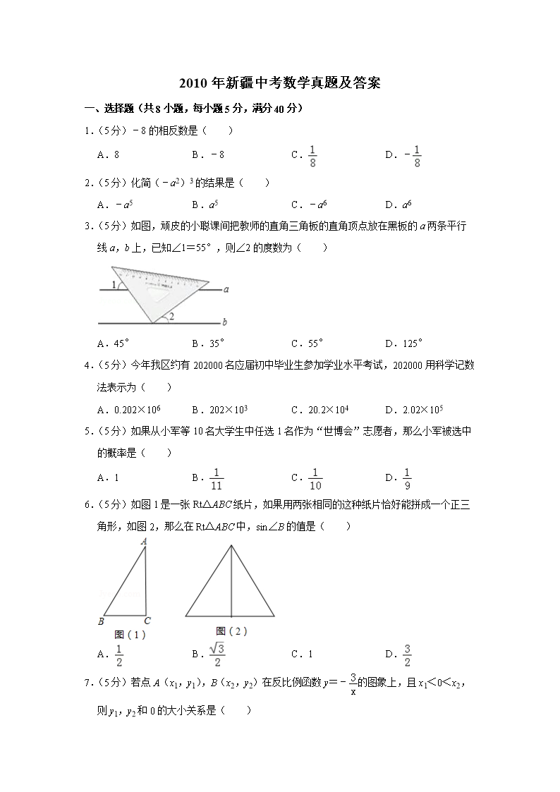 【文档名称】 2010年新疆中考数学真题及答案(Word版).doc