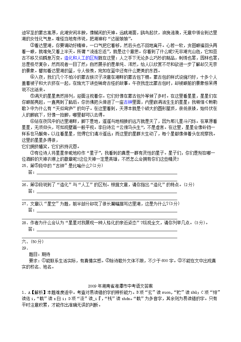 【文档名称】 2009年湖南省湘潭市中考语文真题及答案(Word版).doc