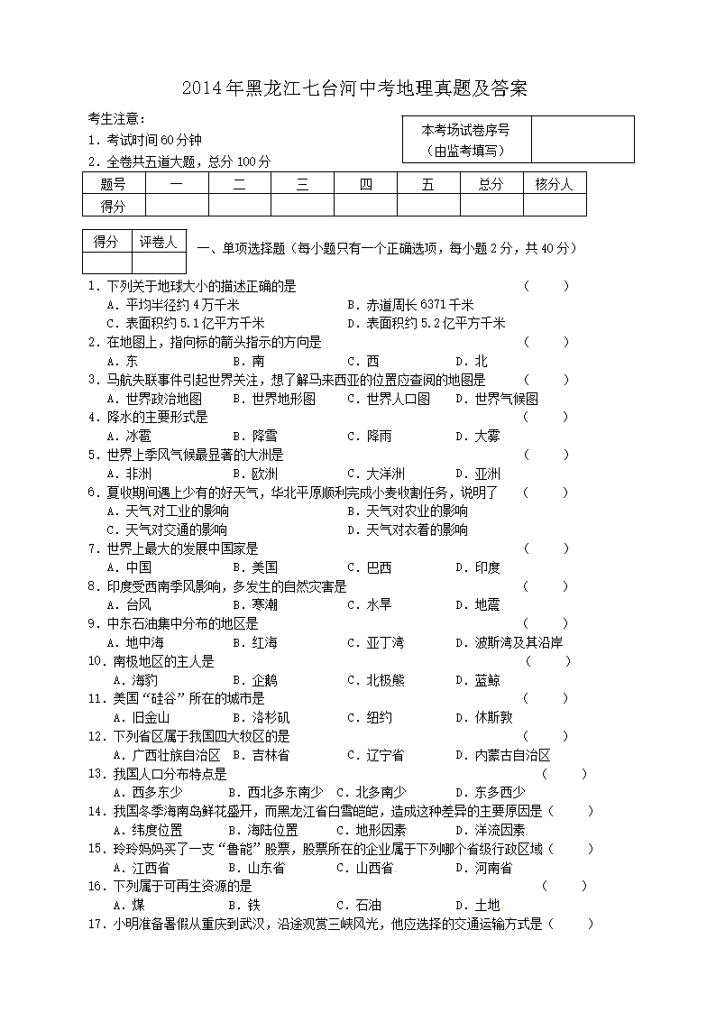【文档预览】 无忧考网整理发布2014年黑龙江七台河中考地理真题及答案(Word版),前五页预览如下: