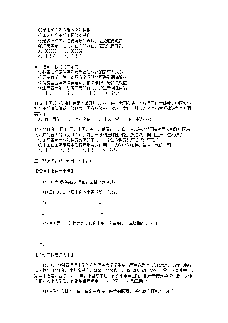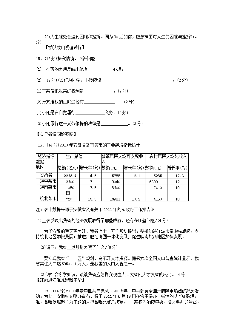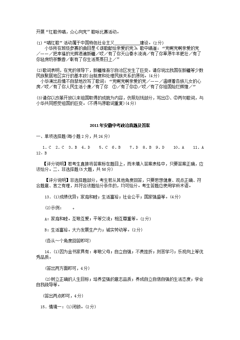 【文档名称】 2011年安徽中考政治真题及答案(Word版).doc