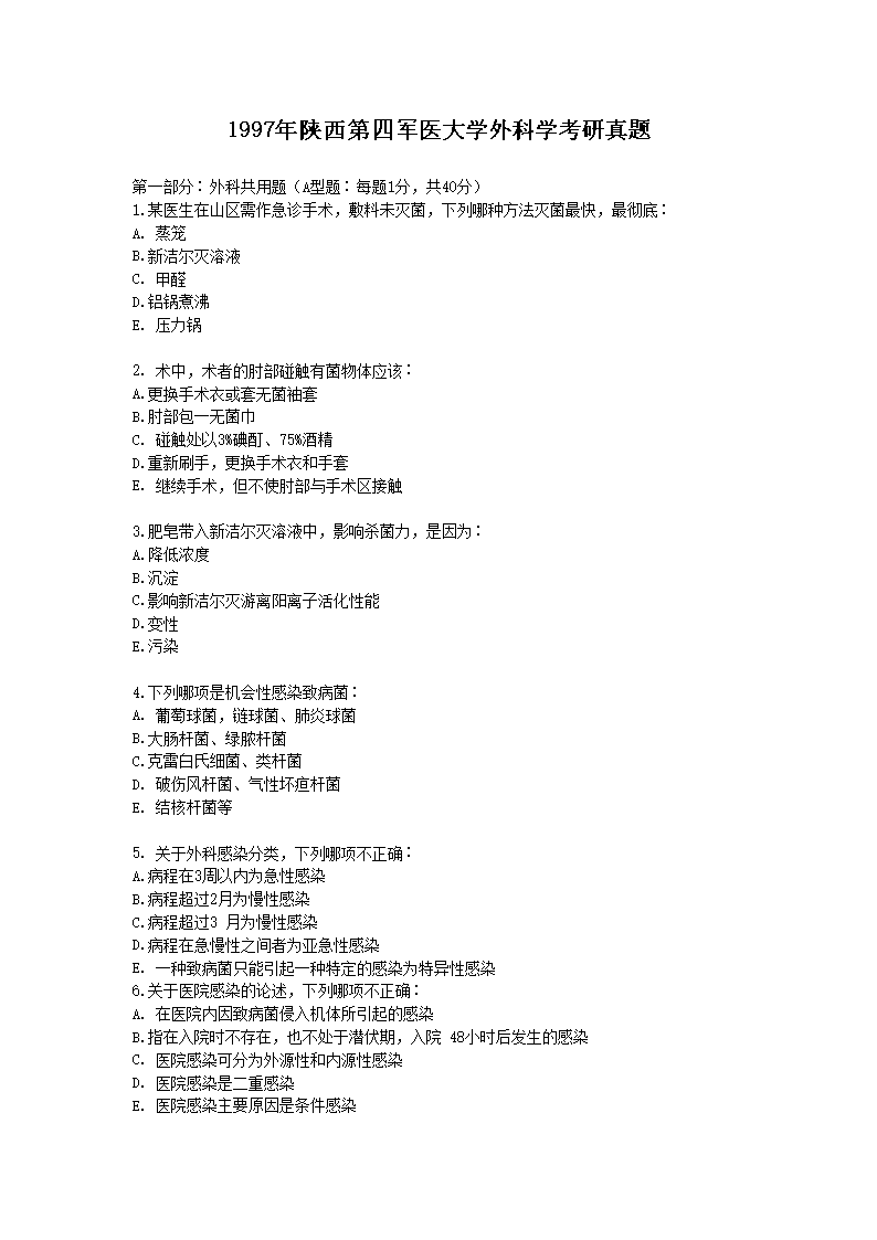 【文档预览】 无忧考网整理发布1997年陕西第四军医大学外科学考研真题(Word版),前五页预览如下: