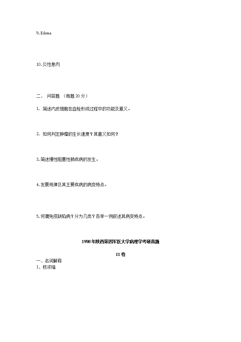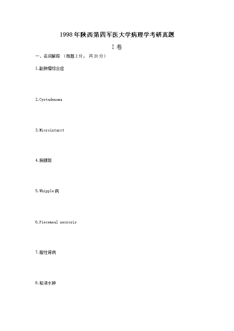 【文档名称】 1998年陕西第四军医大学病理学考研真题(Word版).doc