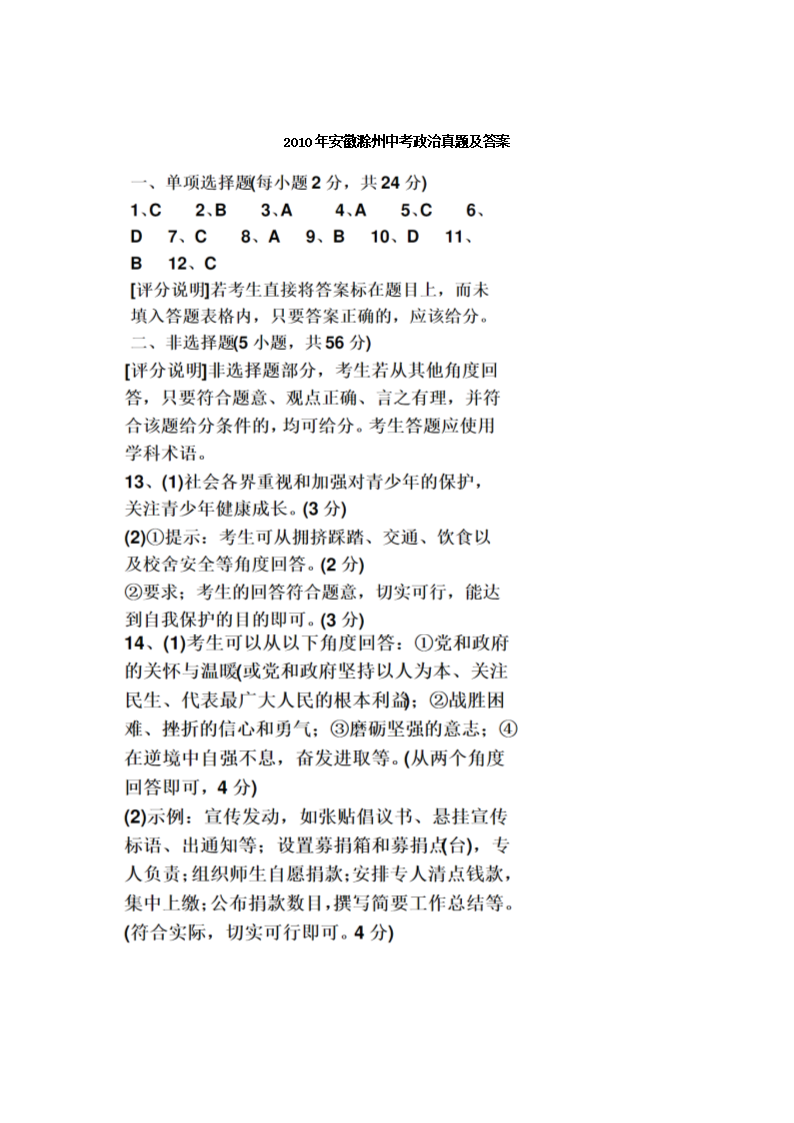 【文档名称】 2010年安徽滁州中考政治真题及答案(Word版).doc