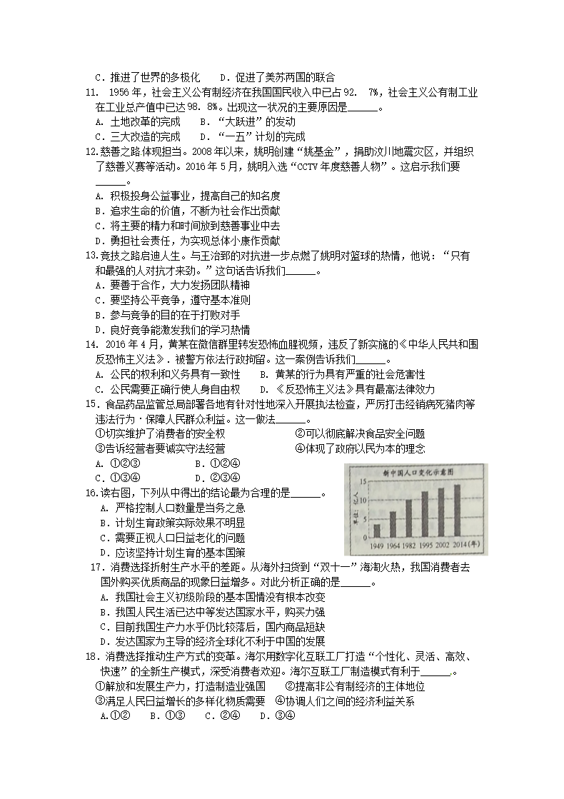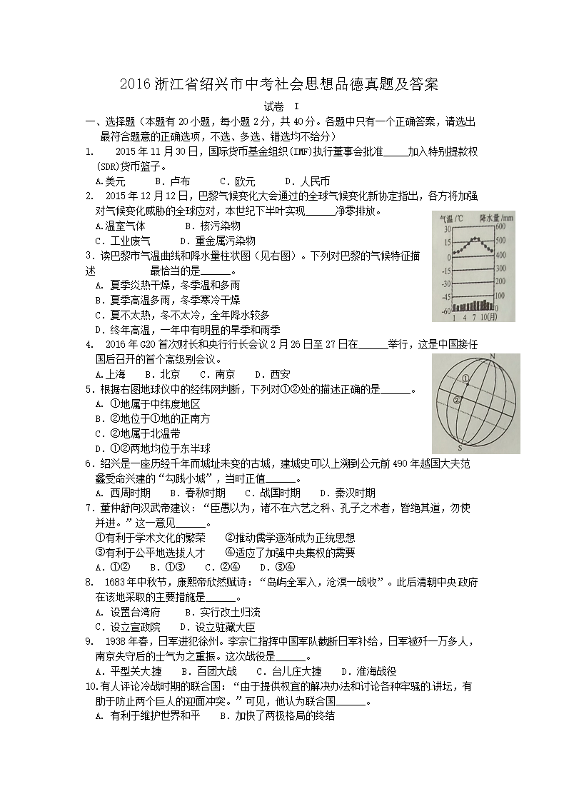 【文档名称】 2016浙江省绍兴市中考社会思想品德真题及答案(Word版).doc