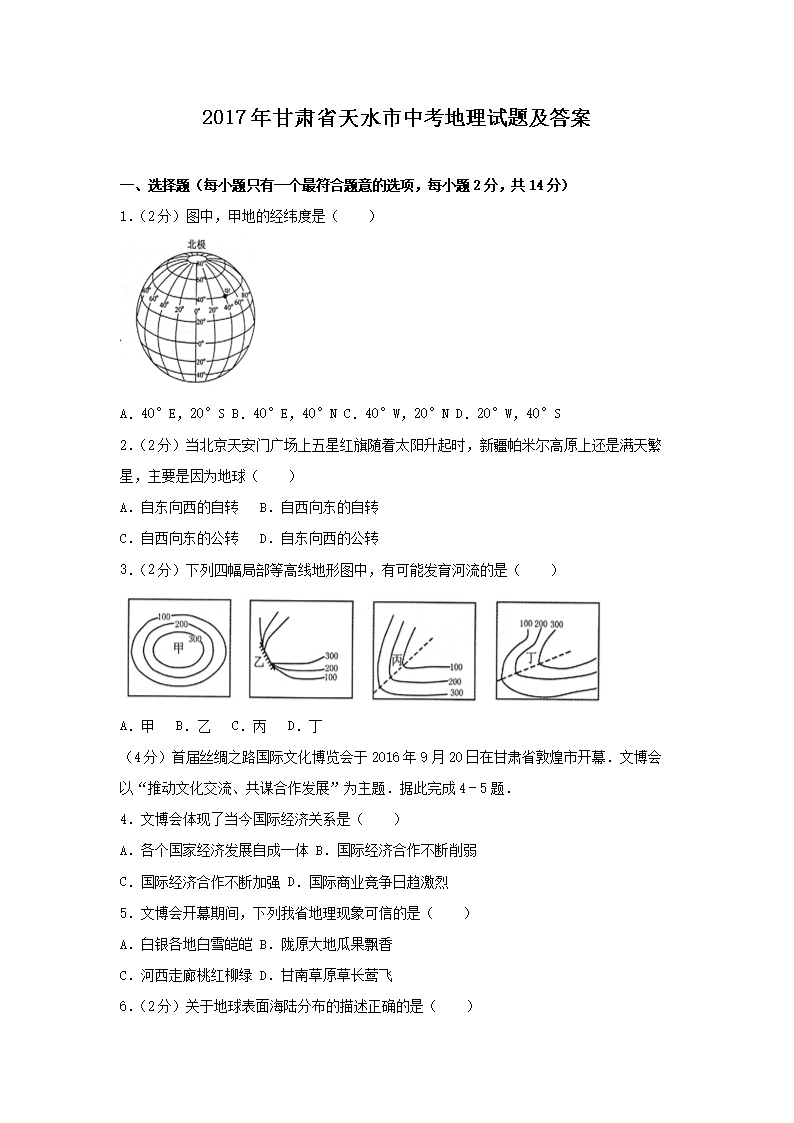 【文档预览】 无忧考网整理发布2017年甘肃省天水市中考地理试题及答案(Word版),前五页预览如下: