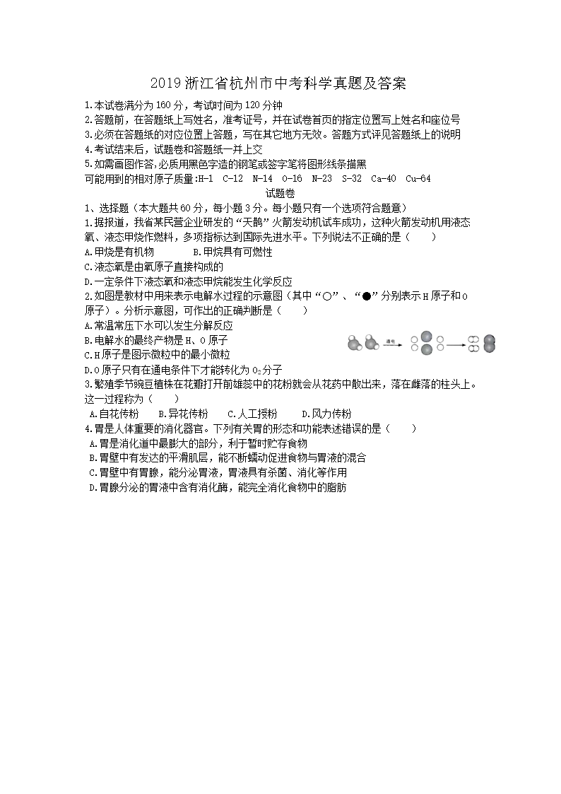 【文档预览】 无忧考网整理发布2019浙江省杭州市中考科学真题及答案(Word版),前五页预览如下:
