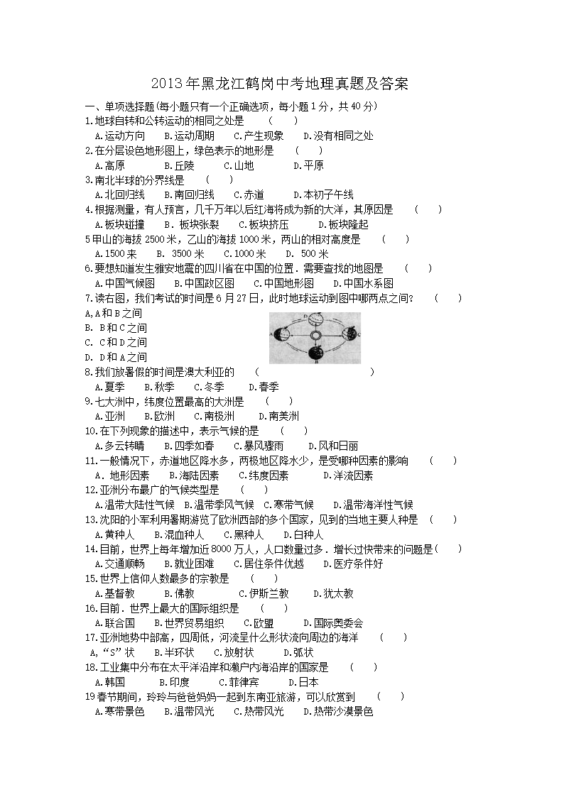 【文档名称】 2013年黑龙江鹤岗中考地理真题及答案(Word版).doc