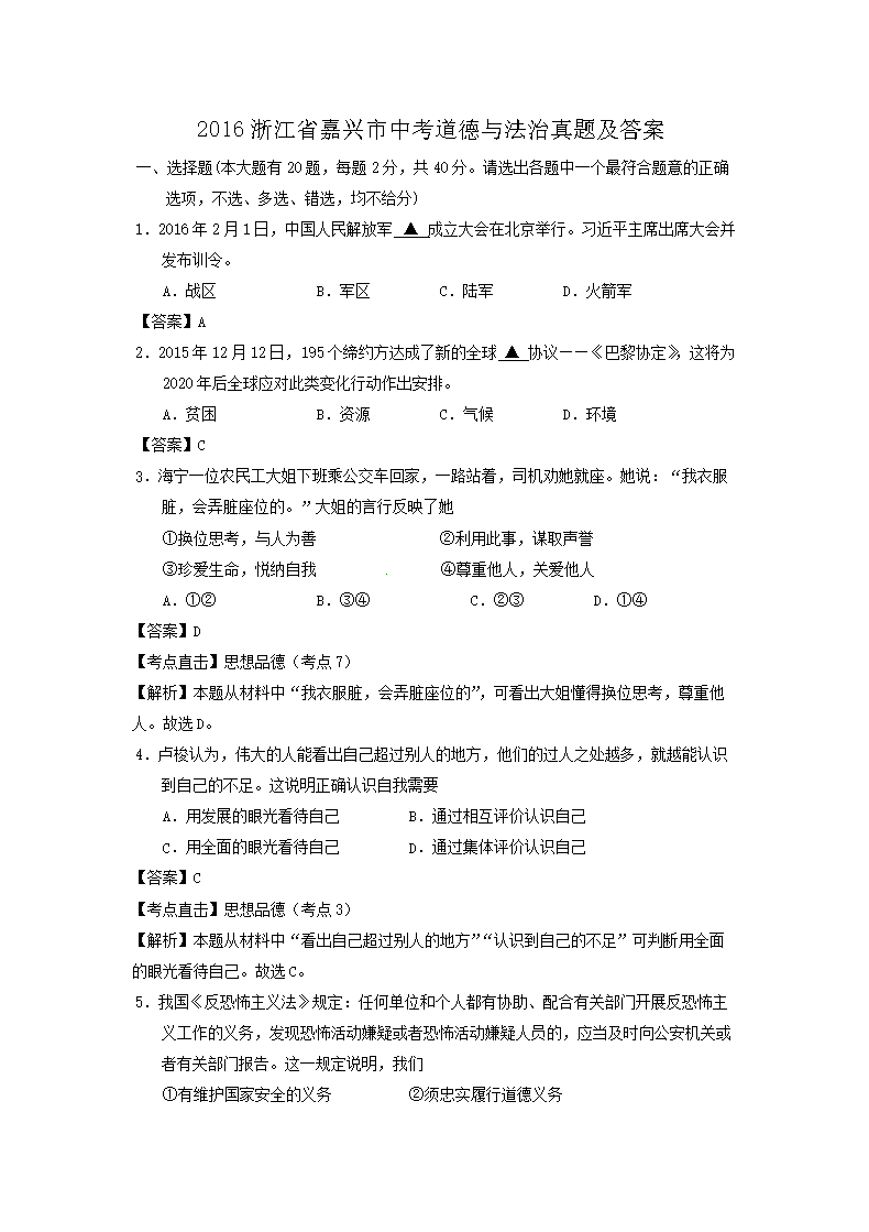 【文档预览】 无忧考网整理发布2016浙江省嘉兴市中考道德与法治真题及答案(Word版),前五页预览如下: