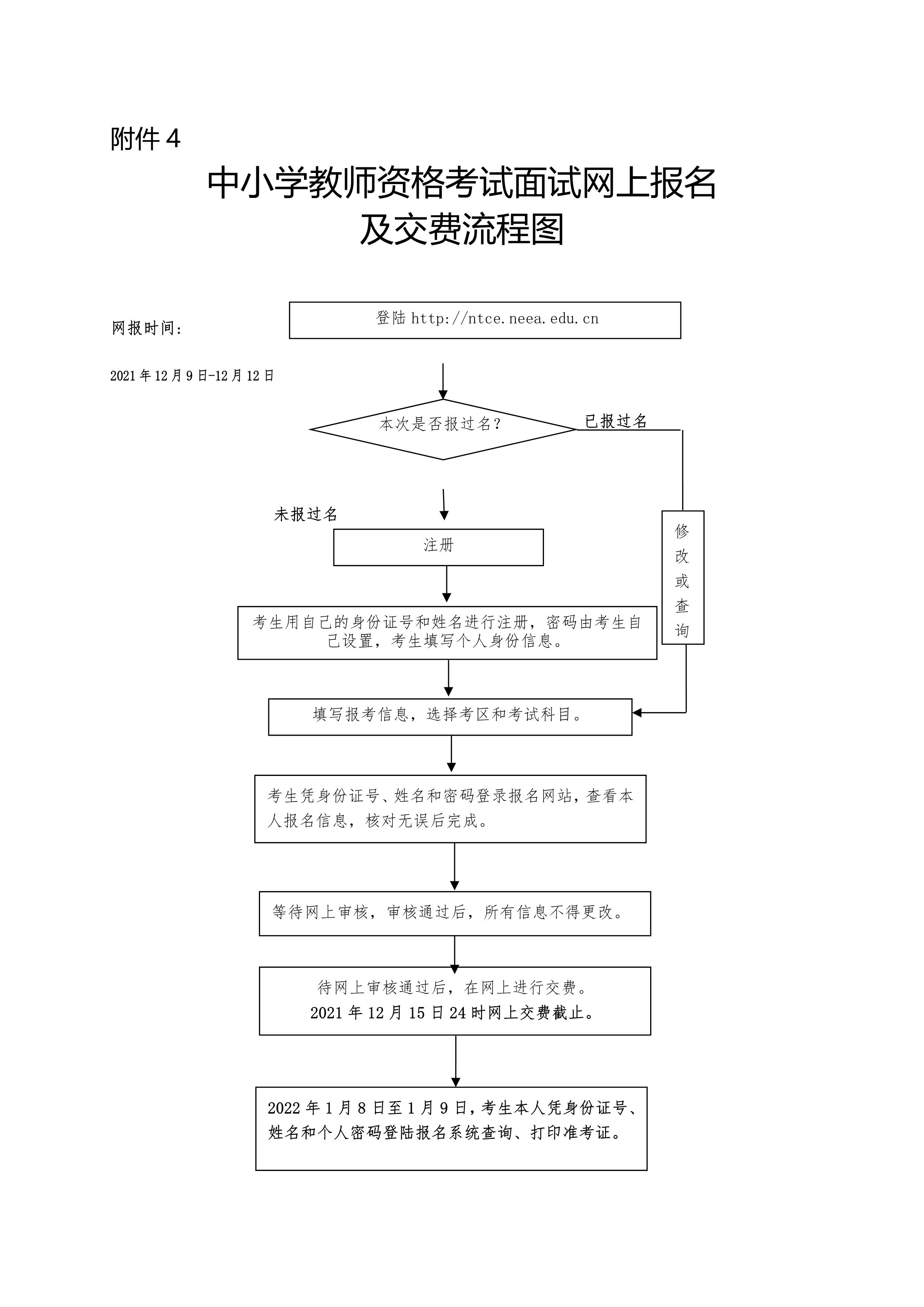 2021年12月9日至12日,考生登录中小学教师资格考试网(http://ntce.neea.edu.cn),按照栏目指引进行网上报名,选择报考考区、面试类别、面试科目等,根据网上报名及交费流程图完成信息录入。特别提示:中职专业课、中职实习指导、日语(初级中学、高级中学、中职文化课)、俄语(初级中学、高级中学、中职文化课)教师资格面试将在重庆科技学院进行,考生只能选择“重庆科技学院”考区报名,其它考区不接收以上科目教师资格考试面试的报考。