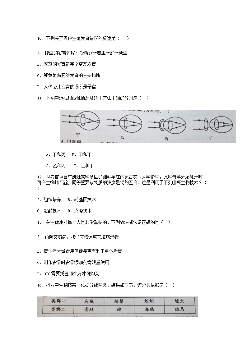 【文档名称】 2014年江西九江中考生物真题及答案(Word版).doc