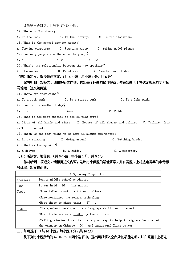 【文档预览】 无忧考网整理发布2019年广西防城港市中考英语真题及答案(Word版),前五页预览如下: