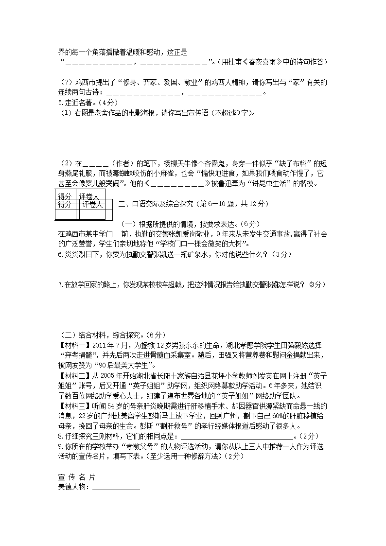 【文档名称】 2012年黑龙江鸡西市中考语文真题及答案(Word版).doc