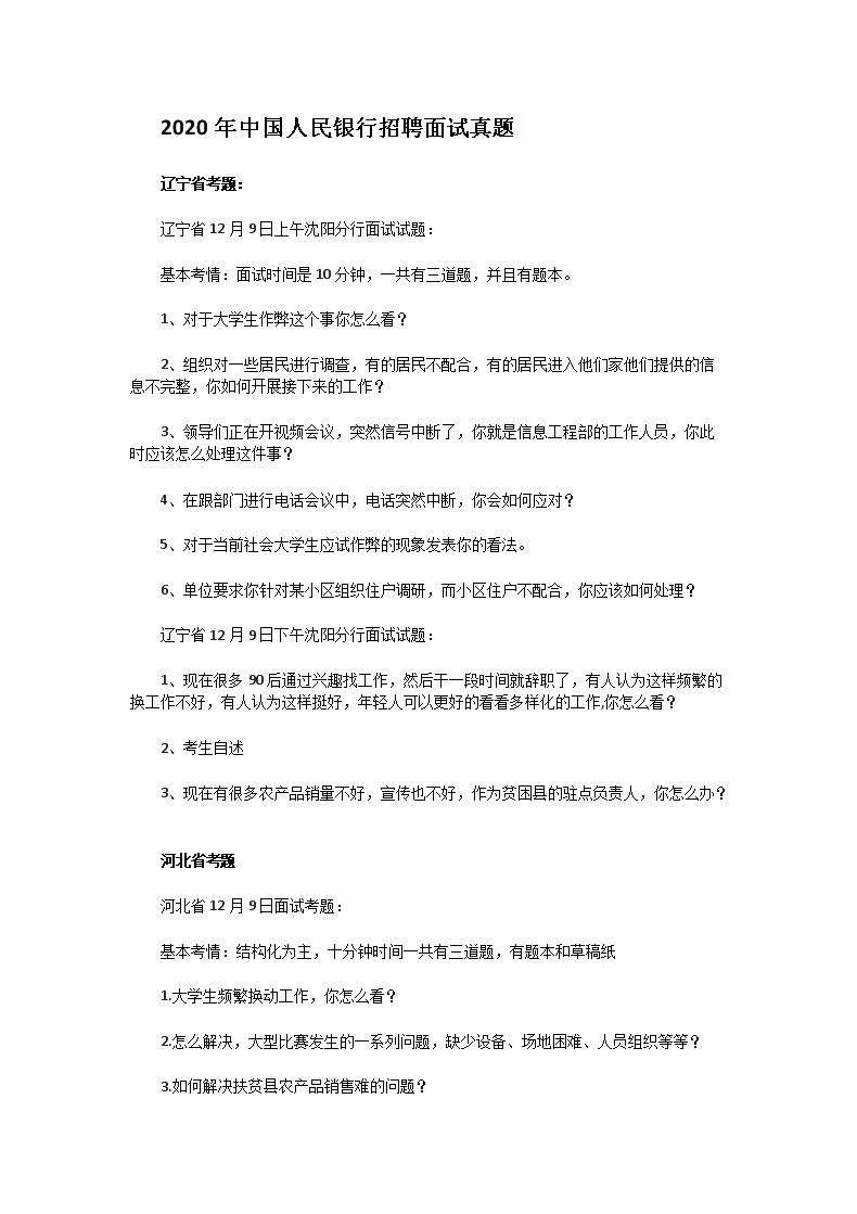 【文档名称】 2020年中国人民银行招聘面试真题(Word版).doc