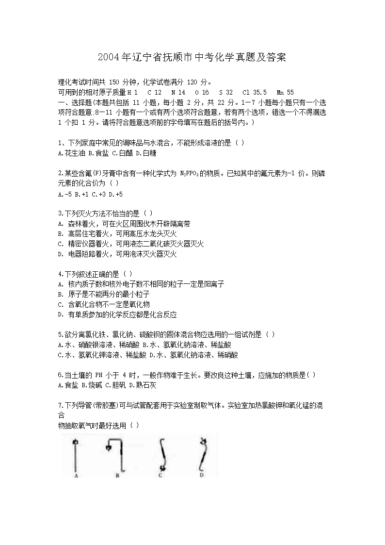 【文档名称】 2004年辽宁省抚顺市中考化学真题及答案(Word版).doc