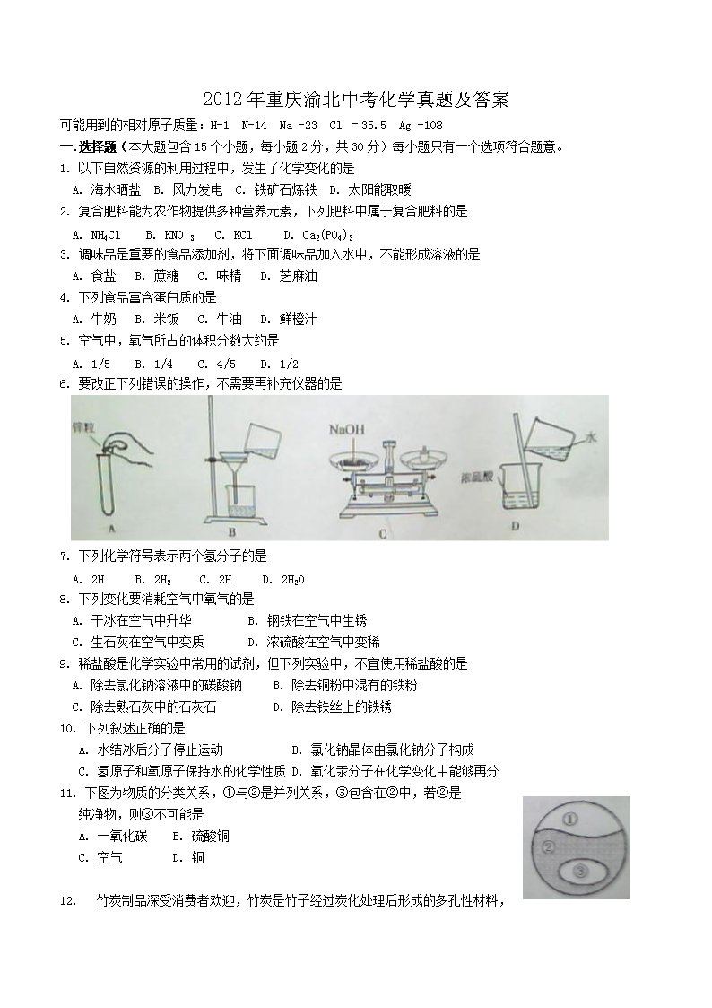 【文档名称】 2012年重庆渝北中考化学真题及答案(Word版).doc