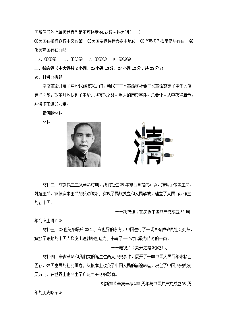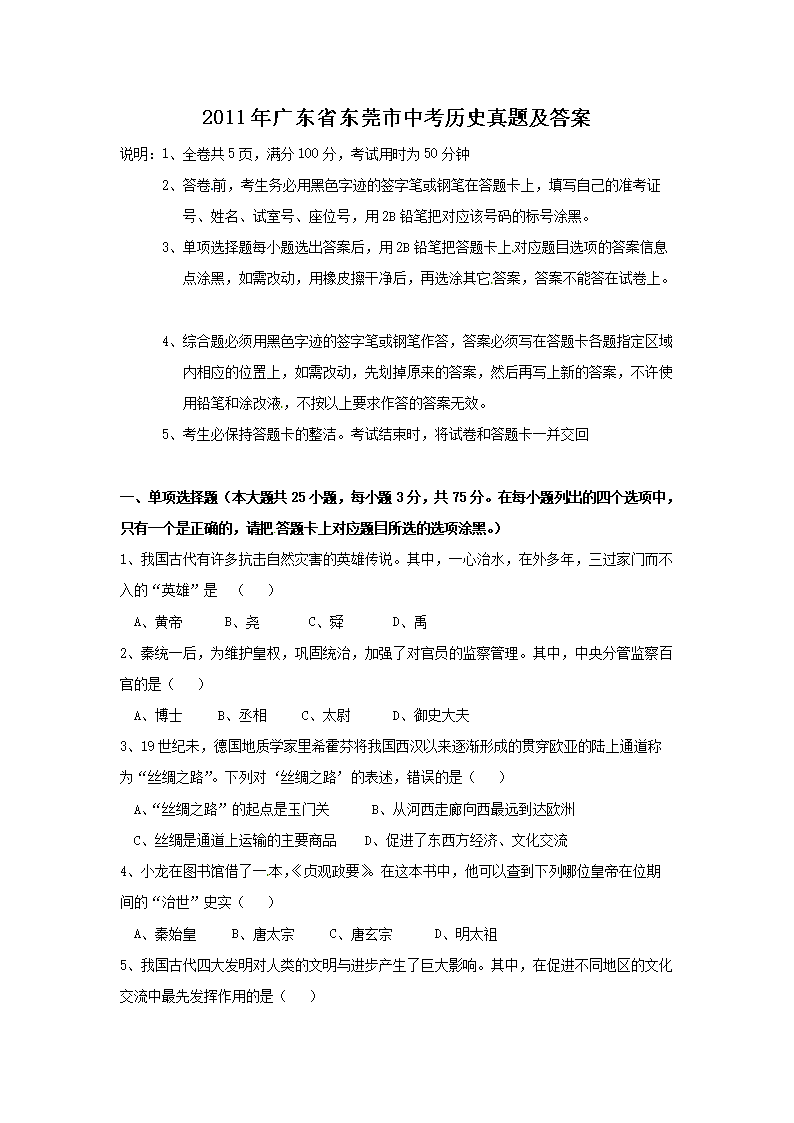 【文档名称】 2011年广东省东莞市中考历史真题及答案(Word版).doc