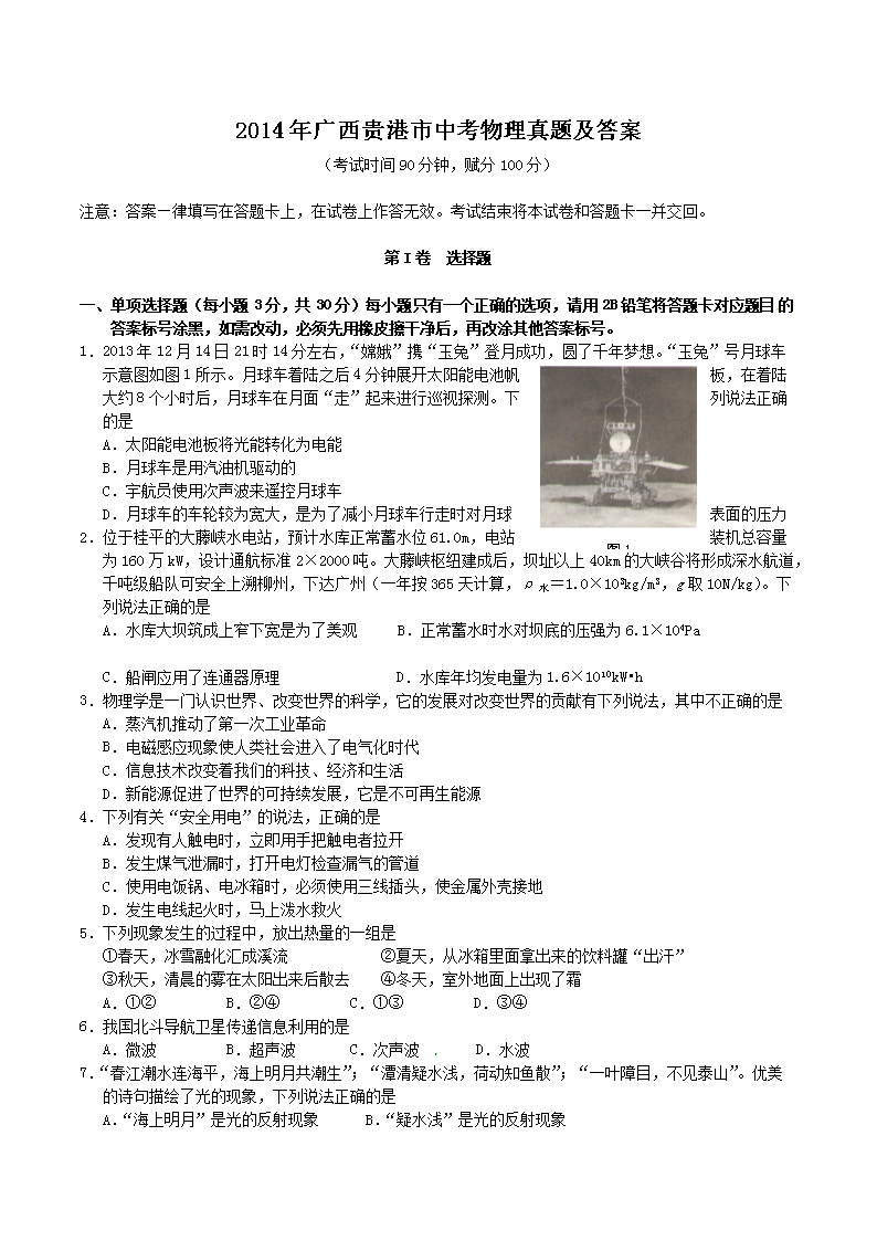 【文档预览】 无忧考网整理发布2014年广西贵港市中考物理真题及答案(Word版),前五页预览如下: