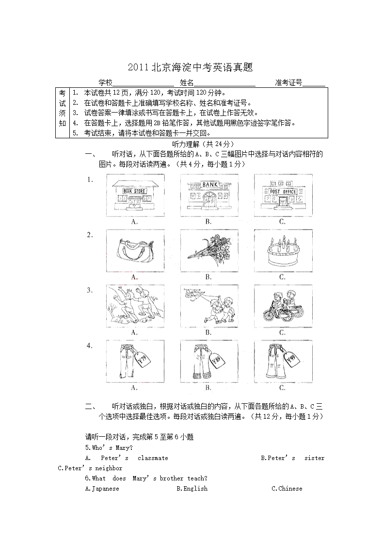 【文档名称】 2011北京海淀中考英语真题(Word版).doc