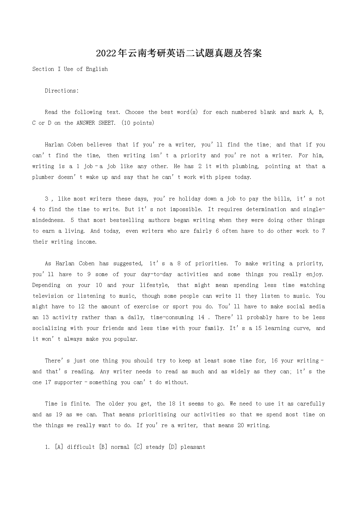 【文档名称】 2022年云南考研英语二试题真题及答案(Word版).doc