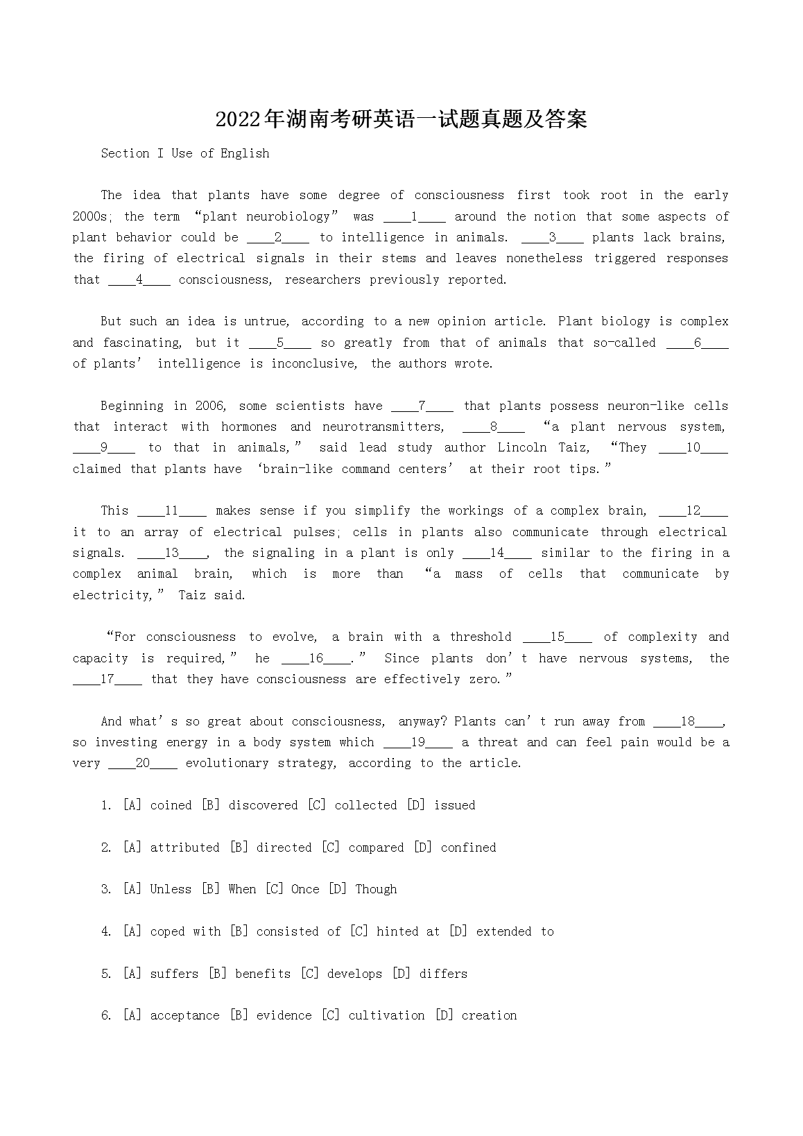 【文档名称】 2022年湖南考研英语一试题真题及答案(Word版).doc