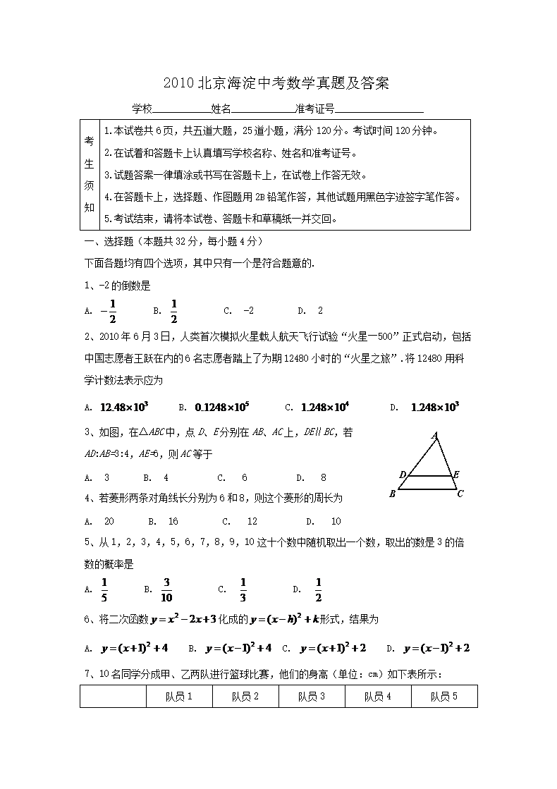 【文档名称】 2010北京海淀中考数学真题及答案(Word版).doc