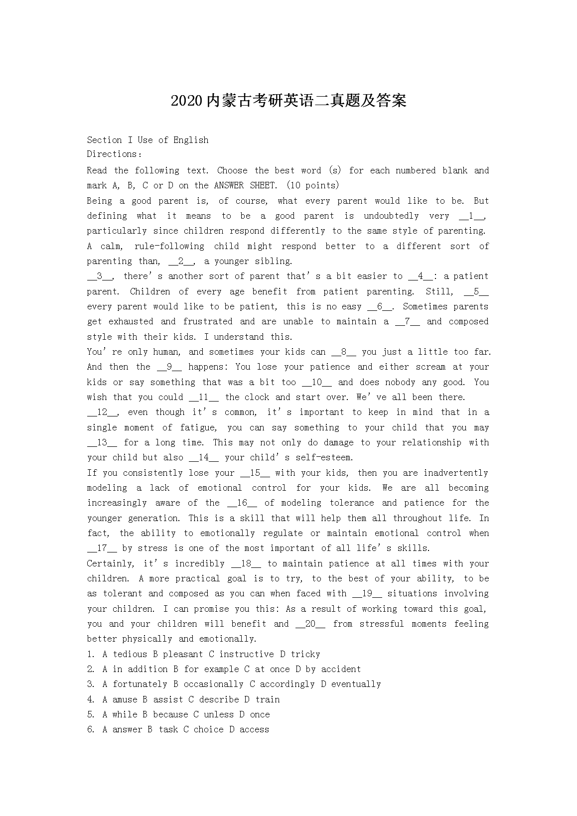 【文档预览】 无忧考网整理发布2020内蒙古考研英语二真题及答案(Word版),前五页预览如下: