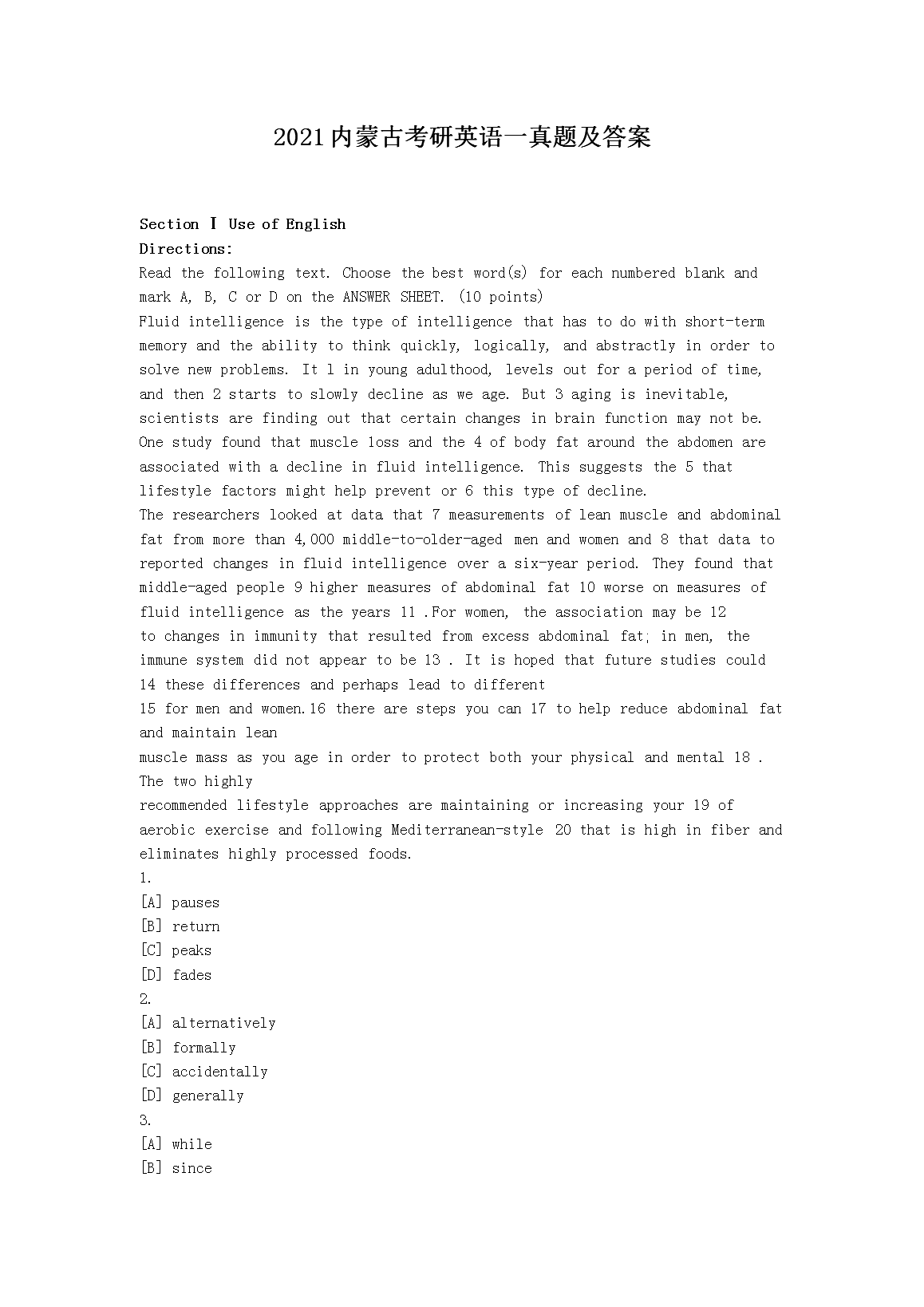 【文档名称】 2021内蒙古考研英语一真题及答案(Word版).doc