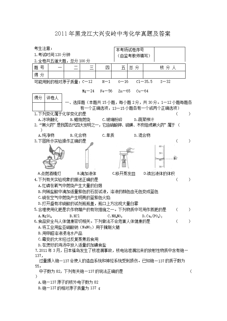【文档预览】 无忧考网整理发布2011年黑龙江大兴安岭中考化学真题及答案(Word版),前五页预览如下: