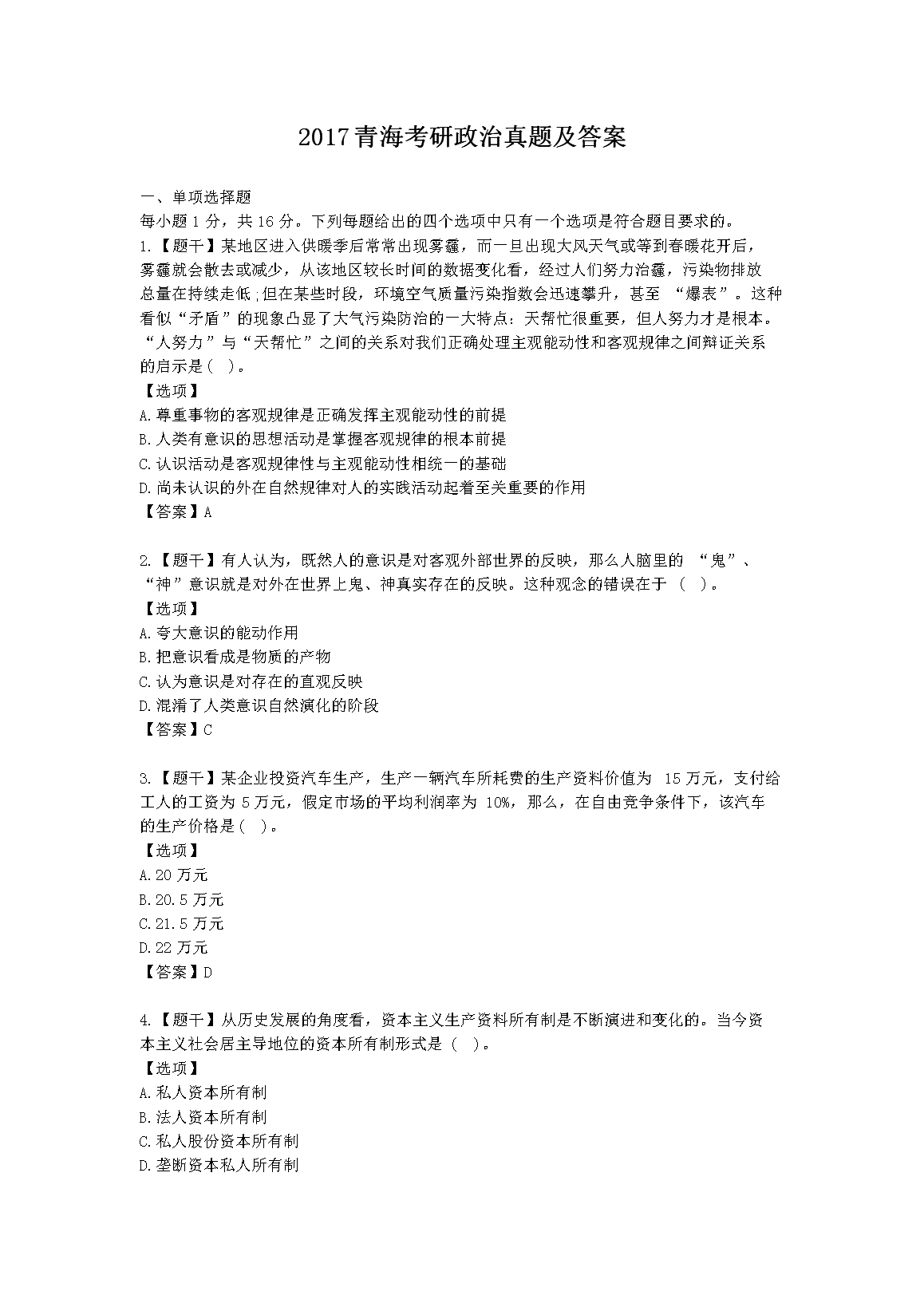 【文档名称】 2017青海考研政治真题及答案(Word版).doc