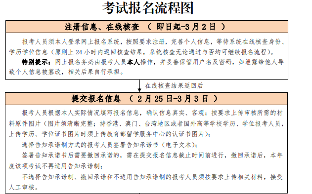 报考人员须确定本人符合报名条件,承诺填报的信息均真实、客观,并签署《专业技术人员资格考试报名证明事项告知承诺制告知承诺书》(电子文本) ,切勿委托他人或机构填写报名信息、代替本人作出书面(含电子文本)承诺。考试组织机构将在考前、考中、考后对报考人员承诺的内容开展核查,成绩合格拟取得资格证书人员信息将在网站进行公示,接受社会监督。不实.填报、虚假承诺的人员将被记入专业技术人员资格考试诚信档案库,纳入全国信用信息共享平台,接受“一处失信、处处受限”的联合惩戒处罚,涉嫌犯罪的,移送司法机关处理。