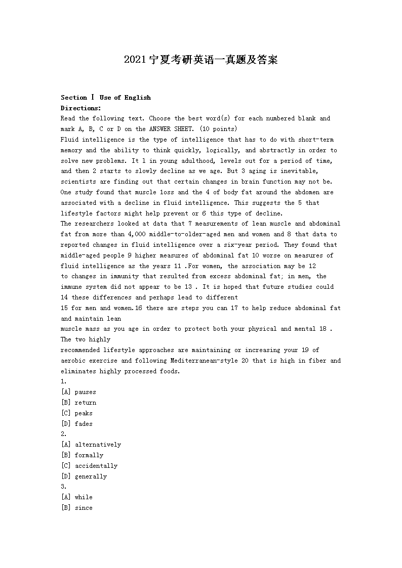 【文档名称】 2021宁夏考研英语一真题及答案(Word版).doc