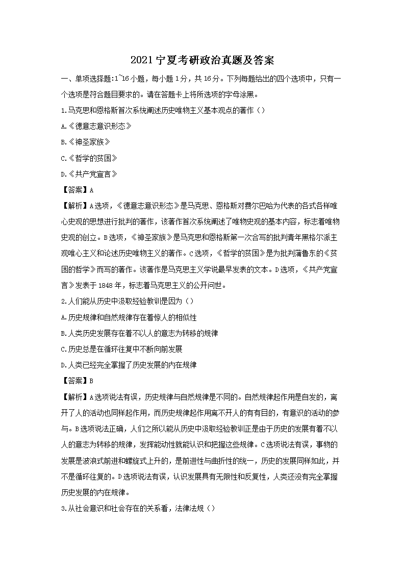 【文档名称】 2021宁夏考研政治真题及答案(Word版).doc
