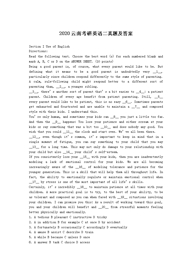 【文档名称】 2020云南考研英语二真题及答案(Word版).doc