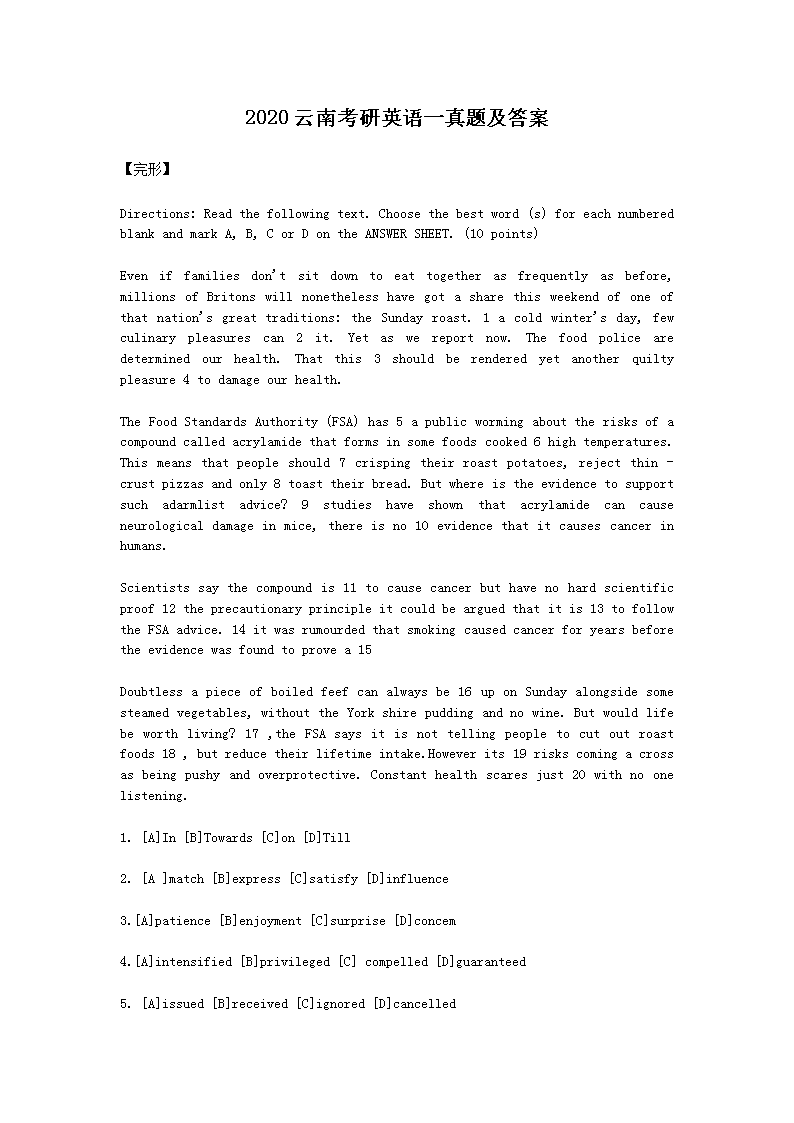 【文档名称】 2020云南考研英语一真题及答案(Word版).doc