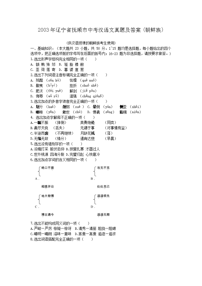 【文档预览】 无忧考网整理发布2003年辽宁省抚顺市中考汉语文真题及答案(朝鲜族)(Word版),前五页预览如下:
