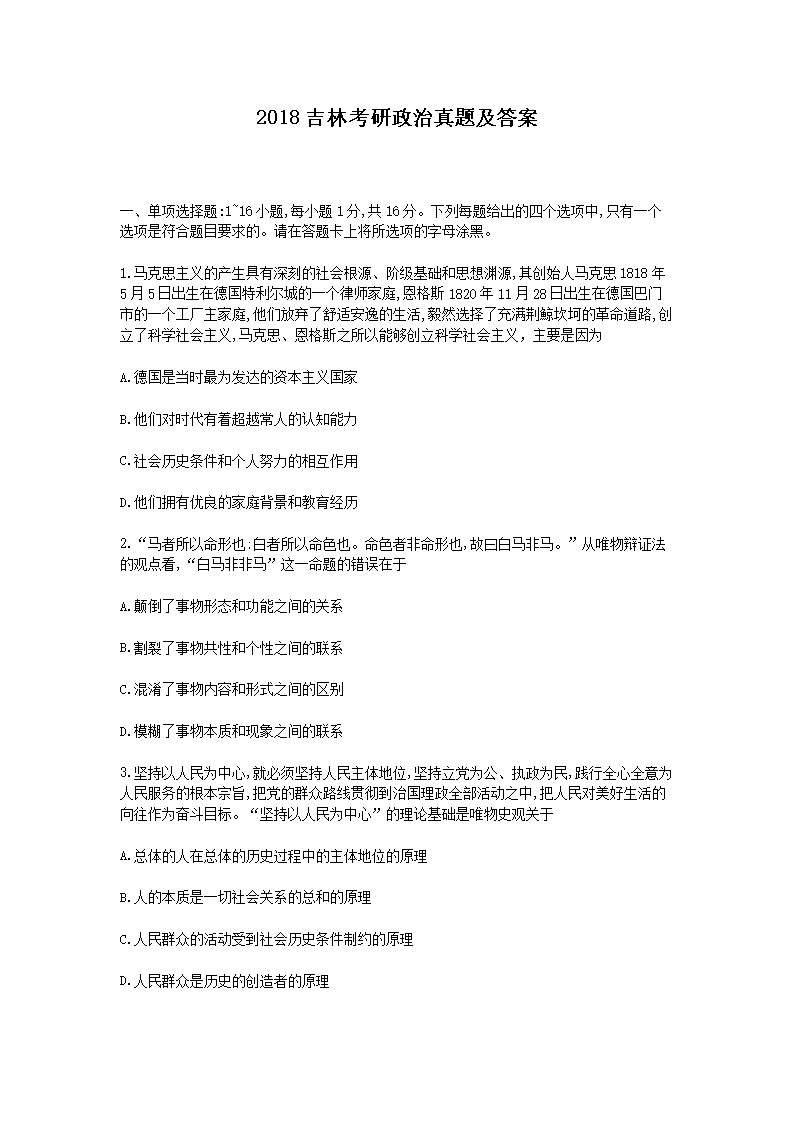 【文档名称】 2018吉林考研政治真题及答案(Word版).doc