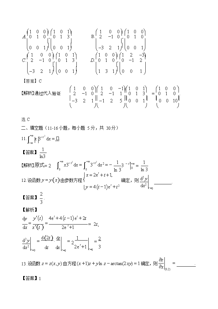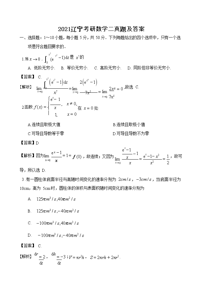 【文档名称】 2021辽宁考研数学二真题及答案(Word版).doc