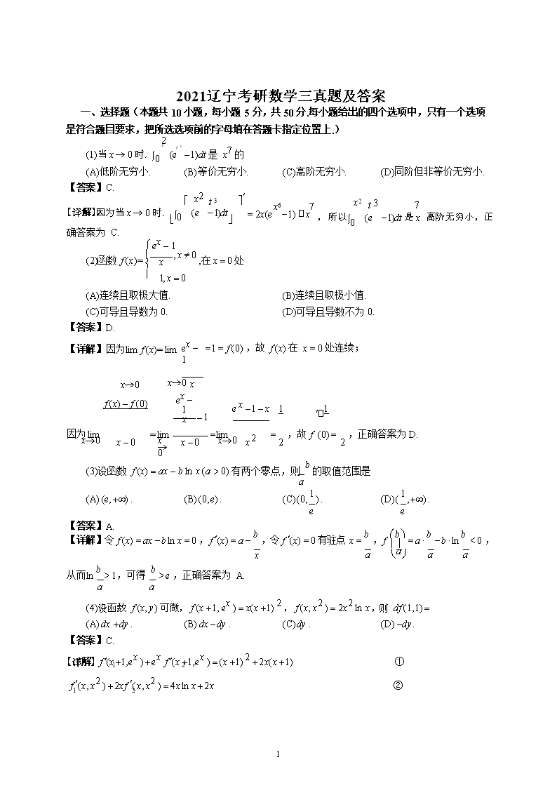【文档名称】 2021辽宁考研数学三真题及答案(Word版).doc