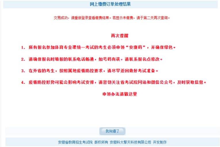 2.凡是报名参加体育专业课统一考试的考生,必须申领“安康码”并确保为绿码。无“安康码”的考生,无法参加考试。“安康码”可通过“皖事通”APP申领,具体申领办法参考安徽政务服务网相关说明,参考网址:https://www.ahzwfw.gov.cn/bog-bsdt/static/yqfkfwzzlAkm.html。