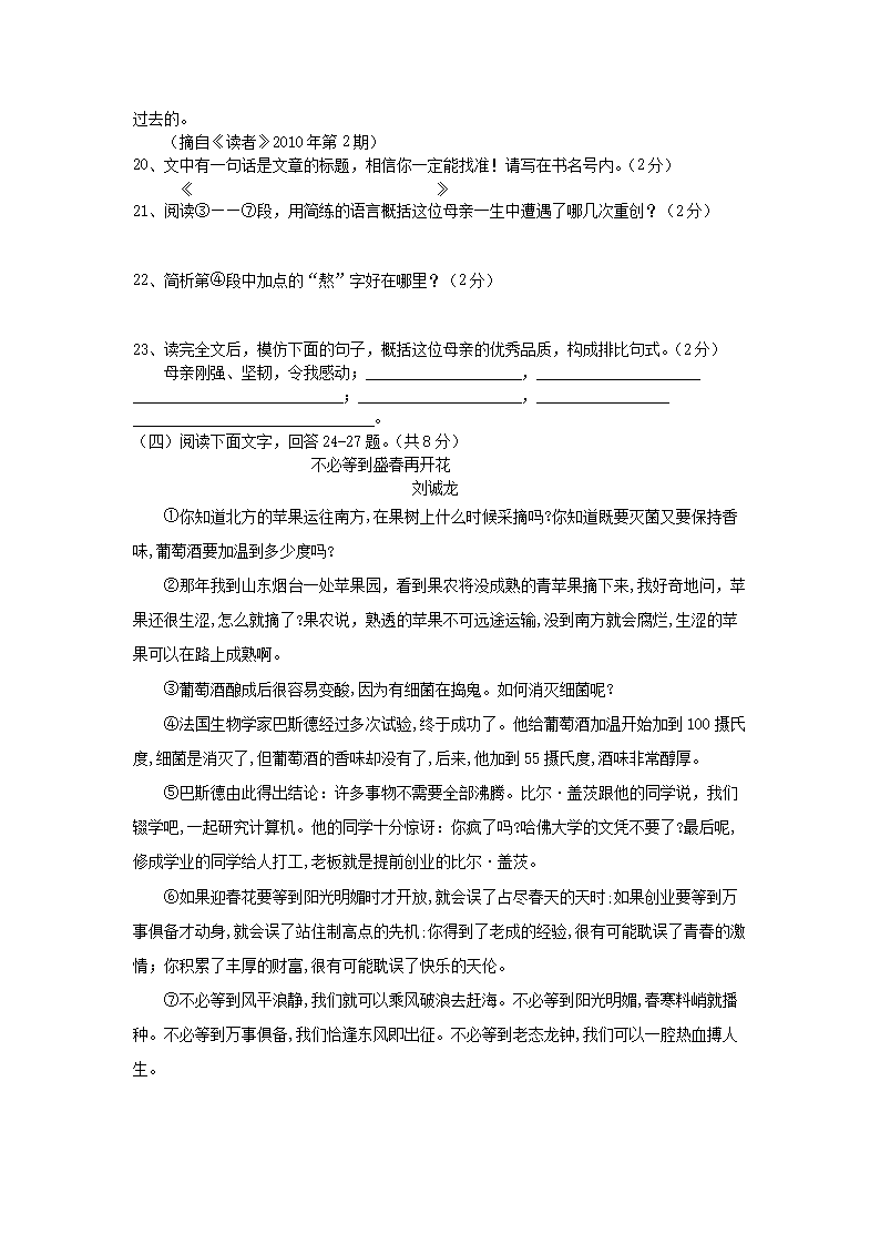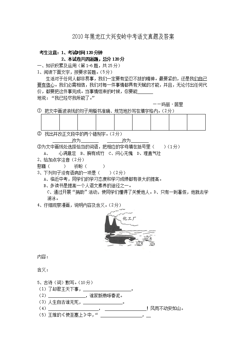 【文档名称】 2010年黑龙江大兴安岭中考语文真题及答案(Word版).doc
