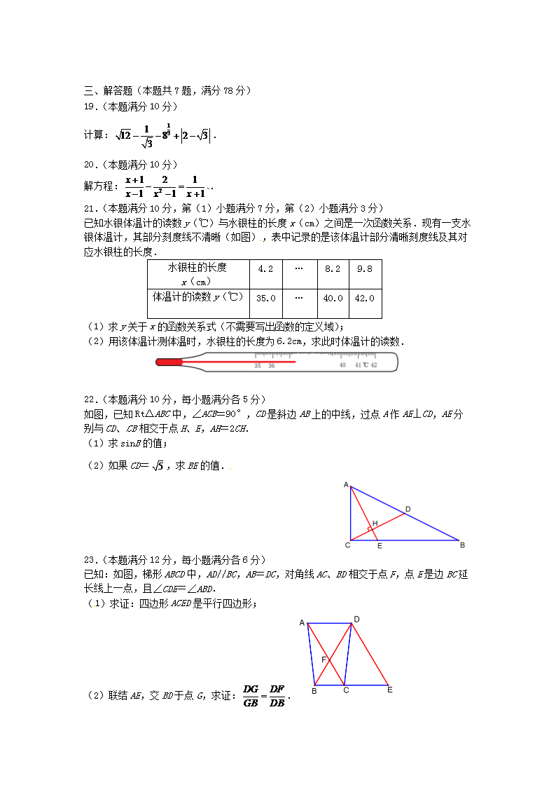 【文档名称】 2014年上海徐汇中考数学真题及答案(Word版).doc